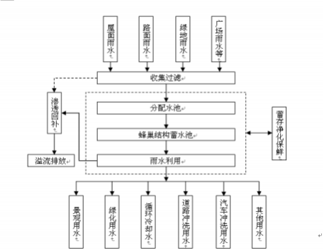 補”、“溢流排放”四個子系統(tǒng)組成,如下圖所示。雨水分別通過由砂基透水 磚鋪裝形成的海綿型吸水地面,以及砂基透水路緣石、濾水溝及溝蓋板等構(gòu)成 的“面式排水”結(jié)構(gòu)收集過濾;過濾后的雨水由導(dǎo)水管流入分配水池,進而流 入蜂巢結(jié)構(gòu)蓄水池,雨水經(jīng)過蜂巢結(jié)構(gòu)的層層過濾,得以凈化,可用于景觀、 綠化、道路沖洗等方面;過量雨水溢流進入“滲透回補”子系統(tǒng),每個滲水井 既起到滯留調(diào)蓄作用,同時又能起到滲透回補地下水作用;當(dāng)降雨量超過上述 系統(tǒng)的容量時,超量溢流的雨水則通過連通到市政管網(wǎng)的已有管道,實現(xiàn)錯峰排放。
