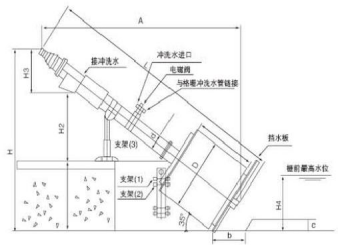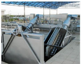 轉(zhuǎn)鼓式格柵機(jī)與水平面成35°角安裝在水渠中,污水從轉(zhuǎn)鼓格柵的端頭流入轉(zhuǎn)鼓格柵中,通過格柵側(cè)面的柵縫流 出,格柵將水中的懸浮物、漂浮物等截留在轉(zhuǎn)鼓中,轉(zhuǎn)鼓格柵以4.6r/min的速度旋轉(zhuǎn),轉(zhuǎn)鼓式格柵機(jī)的上方有尼龍刷和 沖洗水噴嘴,將柵渣從柵縫中清除,同時(shí)通過螺旋輸送并擠壓脫水,最后通過轉(zhuǎn)鼓格柵上端的排料口,物料落入垃圾箱或輸送機(jī)外運(yùn)。